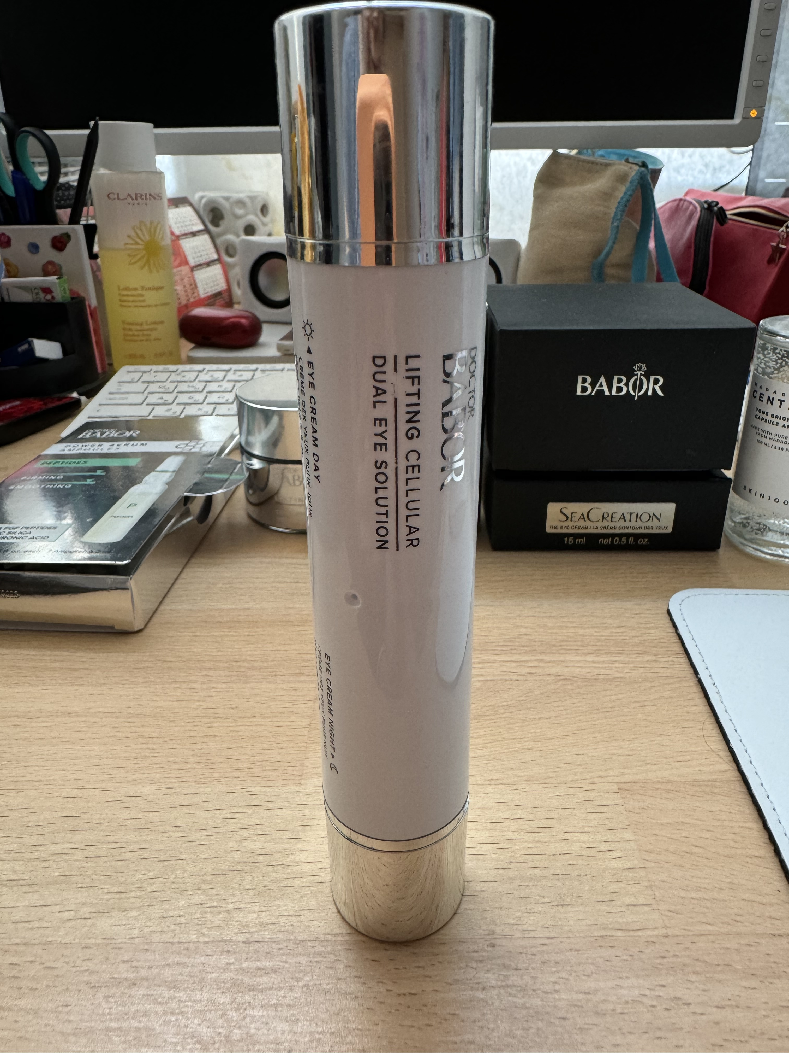 Очень удобно, что в одном флаконе 2 крема для глаз. Большой объем. Дневной крем хорошо увлажняет, не скатывается под макияжем, лёгкий. Ночной крем более плотный, хорошо увлажняет и питает. Наносить не менее чем за 2 часа до сна, чтобы не вызвать отёки глаз на утро.