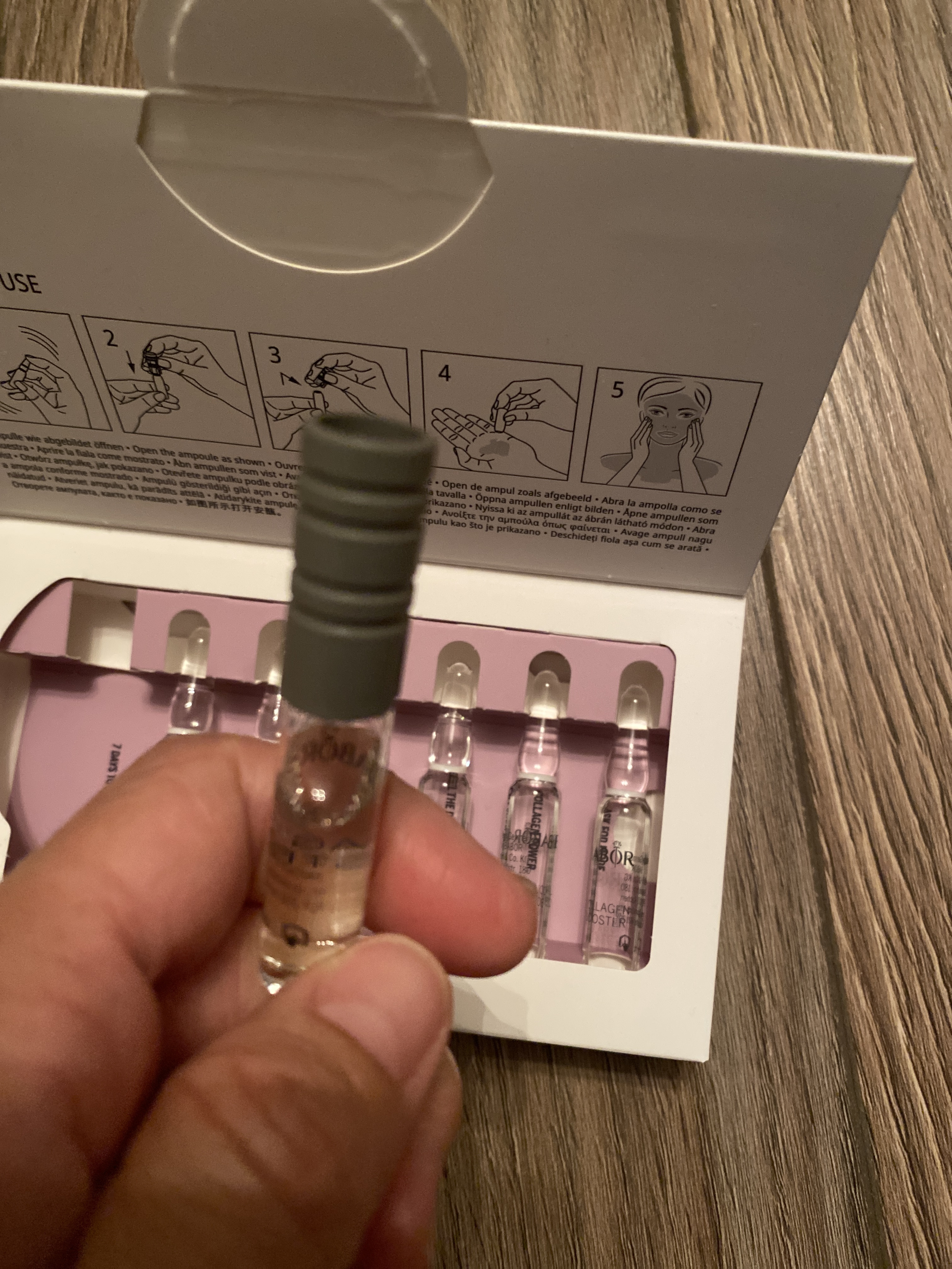 Слегка встряхните ампулу, оберните её горлышко косметической салфеткой или вставьте её в прилагаемое к упаковке пластиковое приспособление для открывания ампул. Резким движением отломите верхнюю часть ампулы по нижнему цветному кольцу.